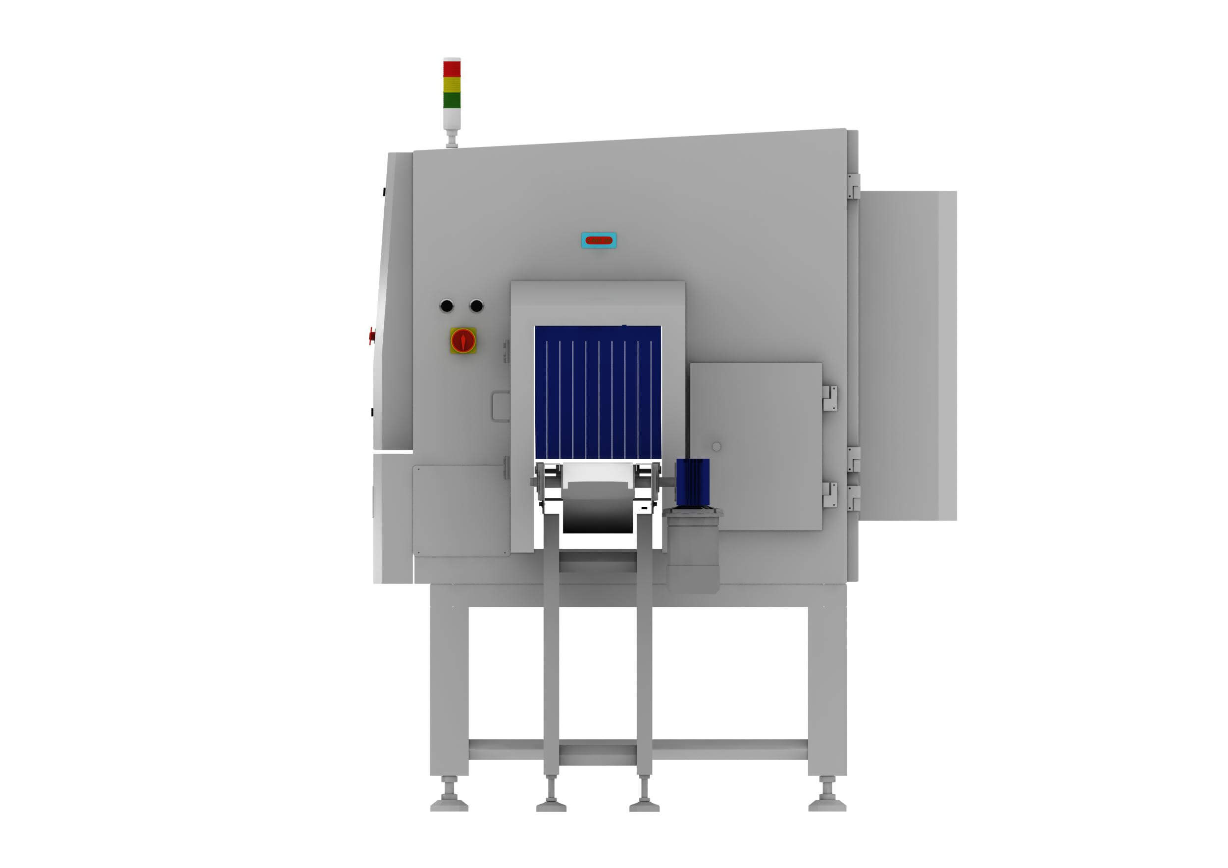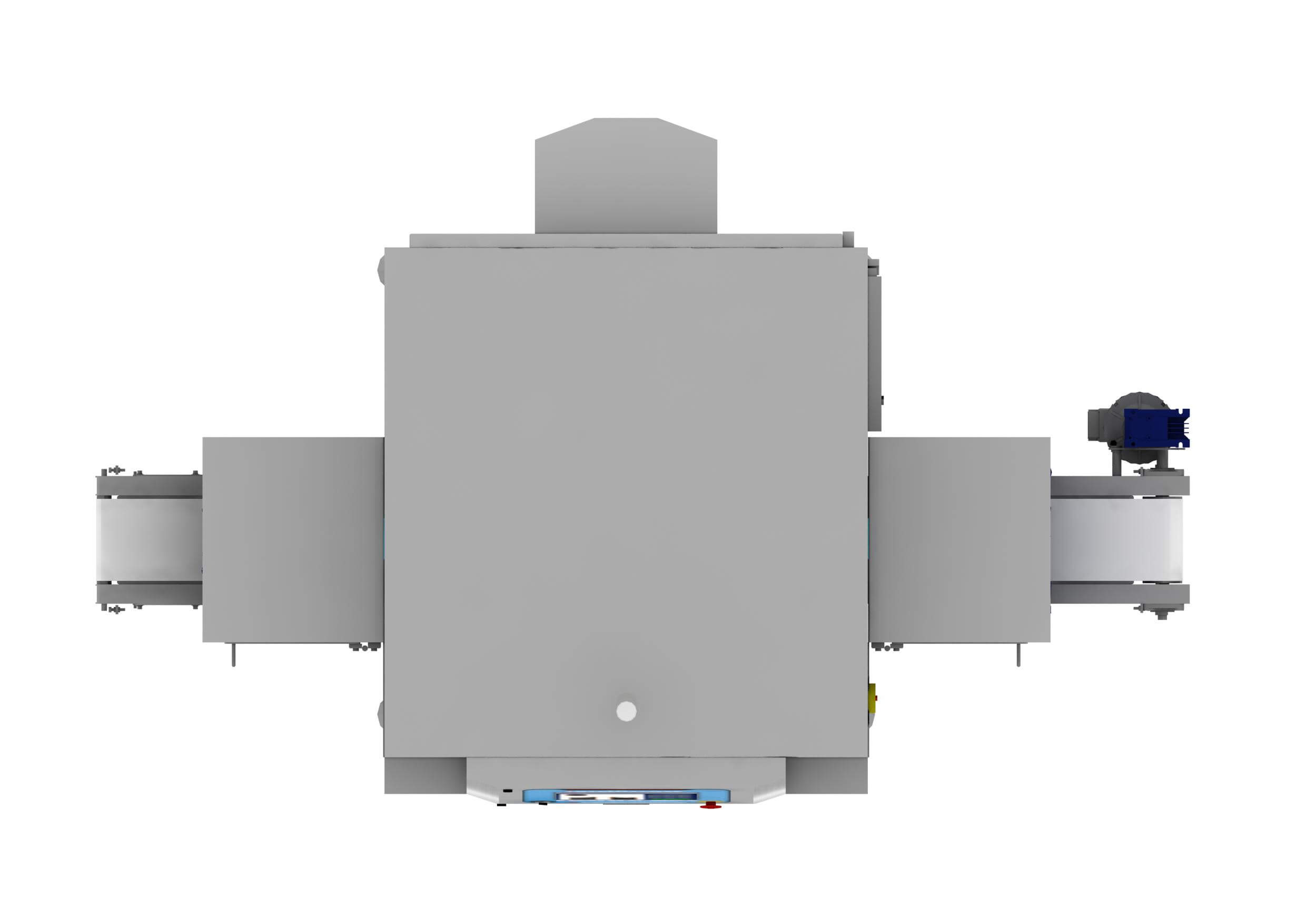 ПРОДУКЦІЯ Скляні пляшки з рідиною (соуси та напої). За допомогою потрійного рентгенівського випромінювання (бічний подвійний + огляд зверху вниз) усуваються сліпі плями в зоні огляду та перевищуються межі огляду системи одиничного / подвійного променя.